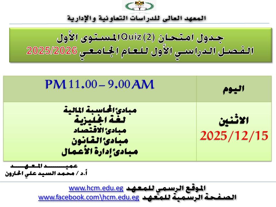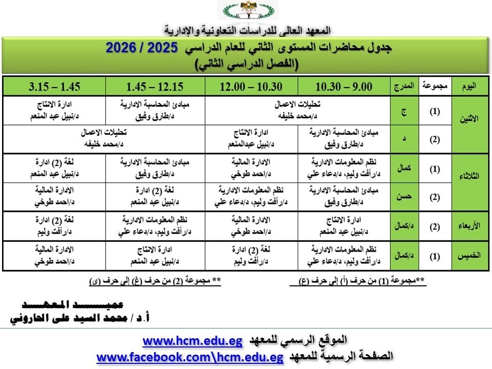 جدول محاضرات المستوى الثانى للعام الدراسي 2025 / 2026 (الفصل الدراسي الأول) |