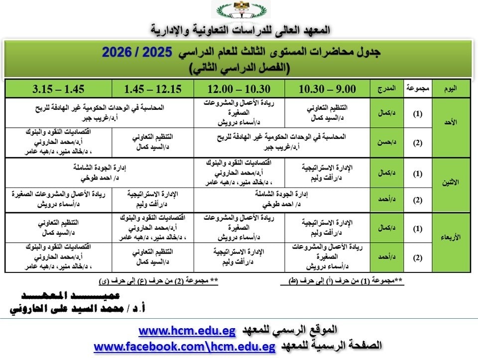 جدول محاضرات المستوى الثالث للعام الدراسي 2025 / 2026 (الفصل الدراسي الأول) |