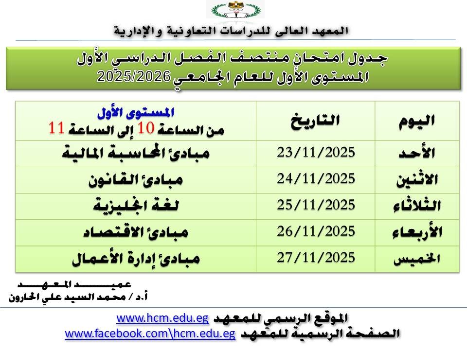 جدول امتحان منتصف الفصل الدراسي الأول للمستوى الأول للعام الجامعي 2025/2026 |
